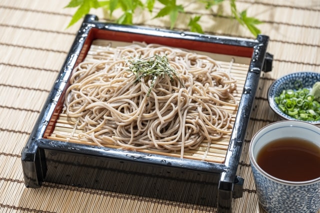 Cold soba noodles served on a bamboo tray (zaru) and dipped in a flavorful soy-based sauce (tsuyu). This refreshing dish is perfect for hot summer days.